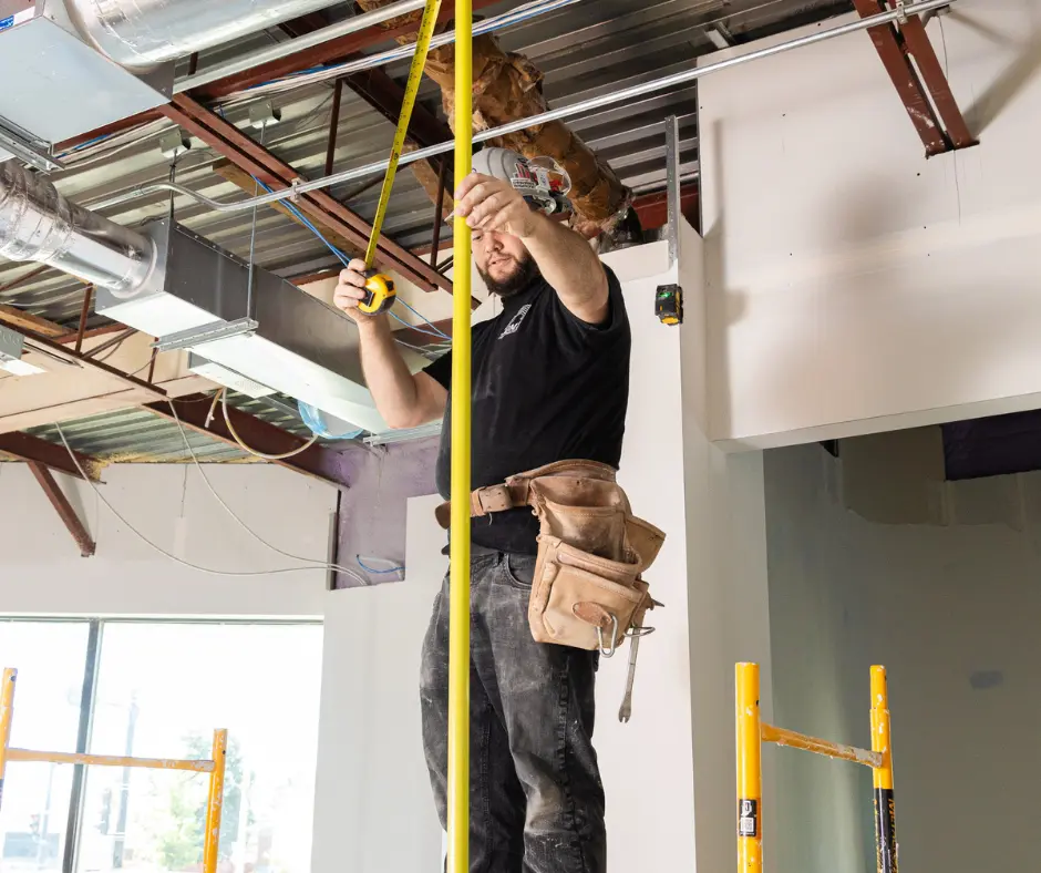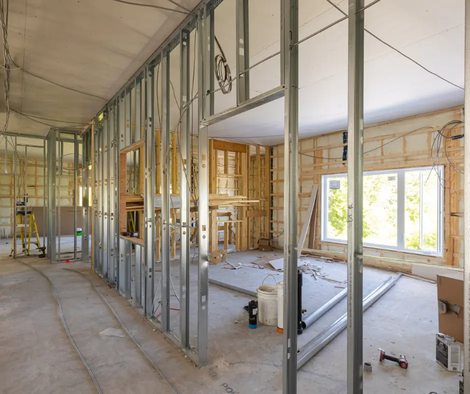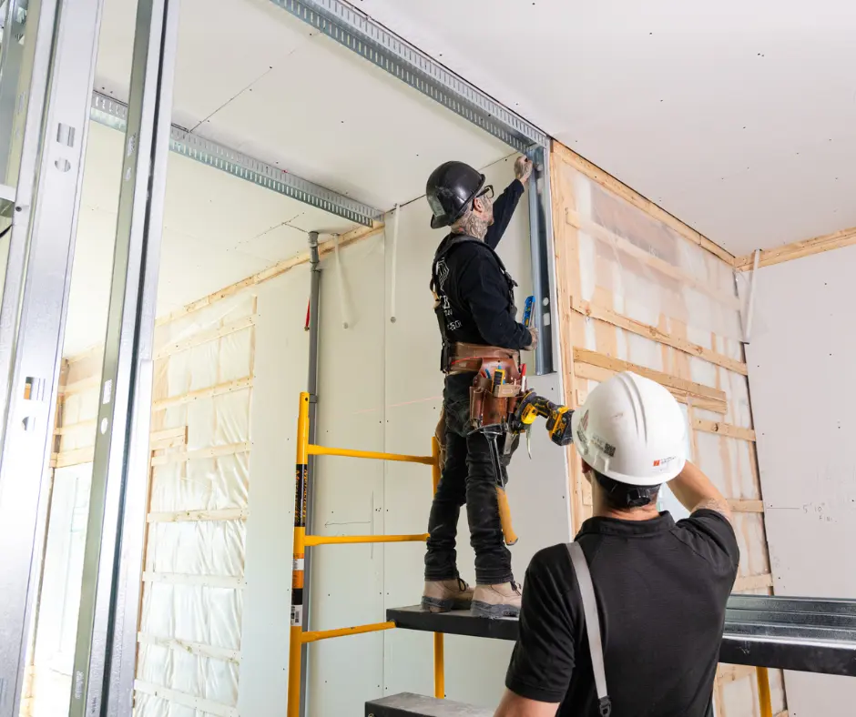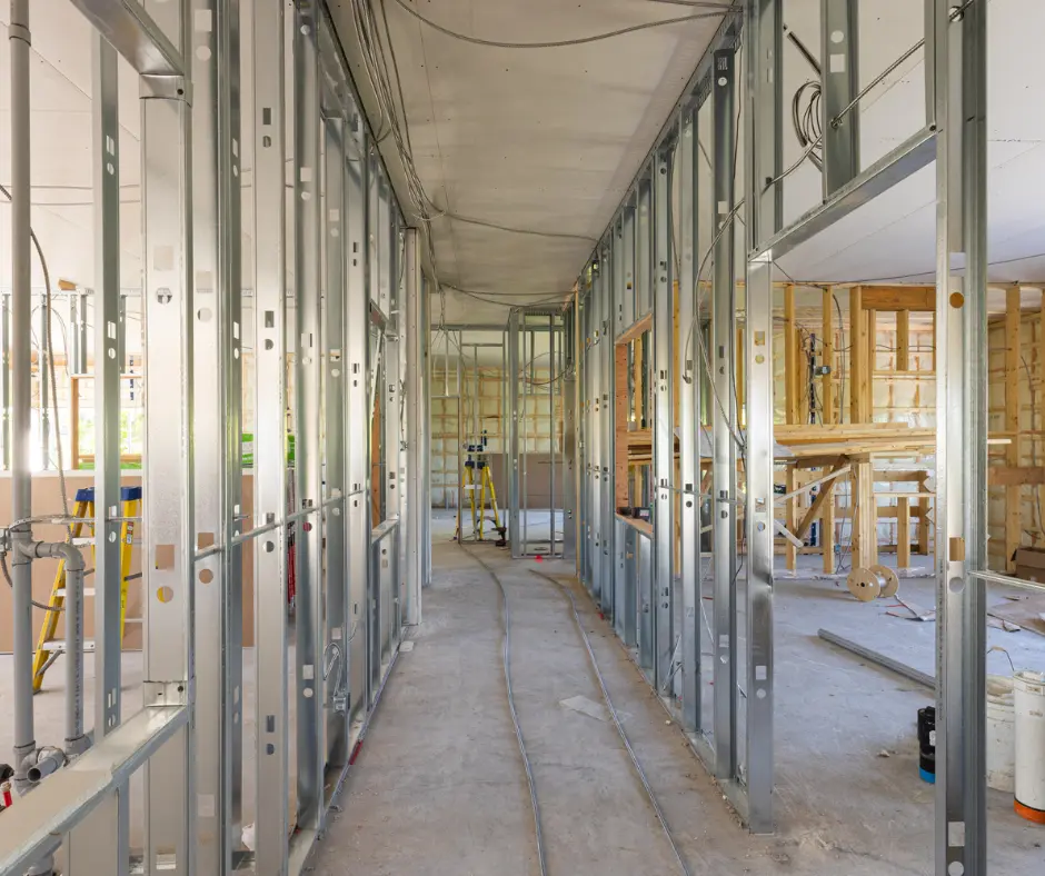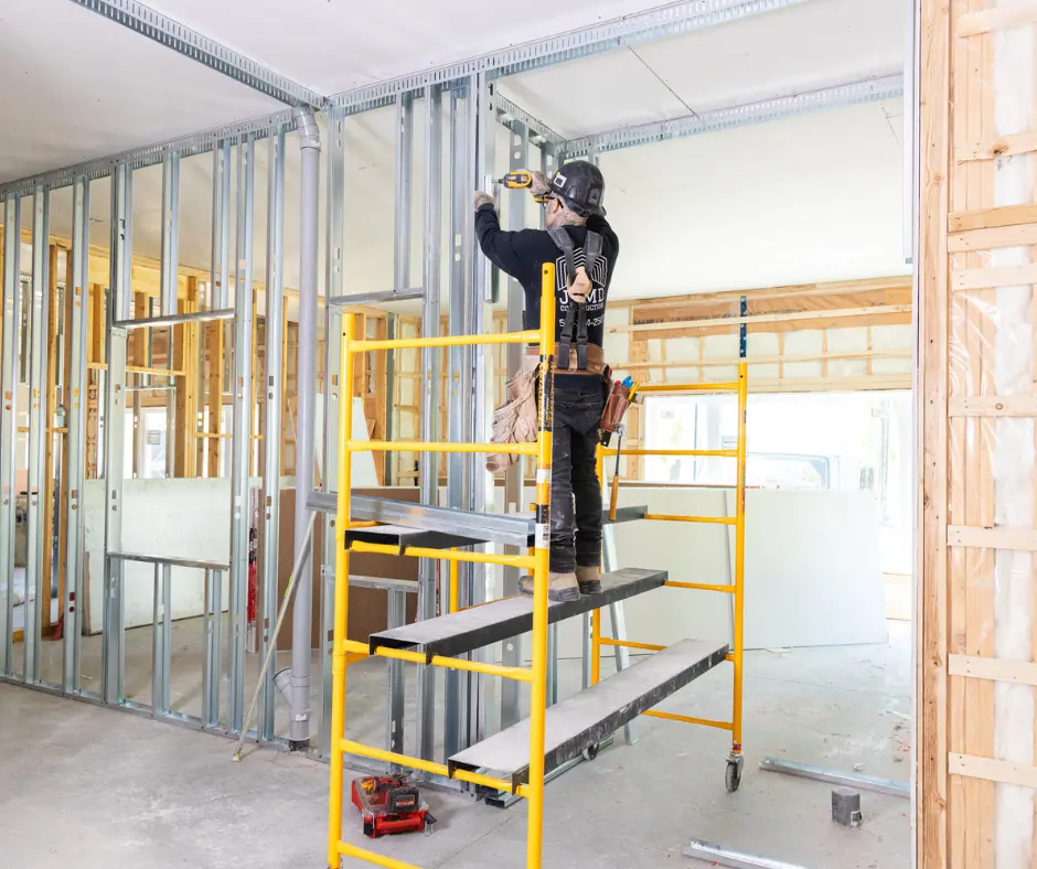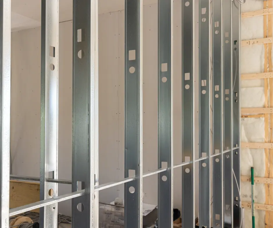 Montage de cloisons intérieures avec structure d’acier pour créer des espaces solides, modulables et conformes aux normes.