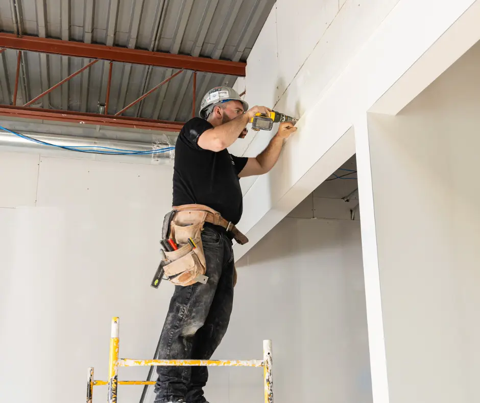 Installation professionnelle de panneaux de gypse (gyproc / drywall) pour murs et plafonds, assurant une base solide, droite et prête à recevoir les finitions.